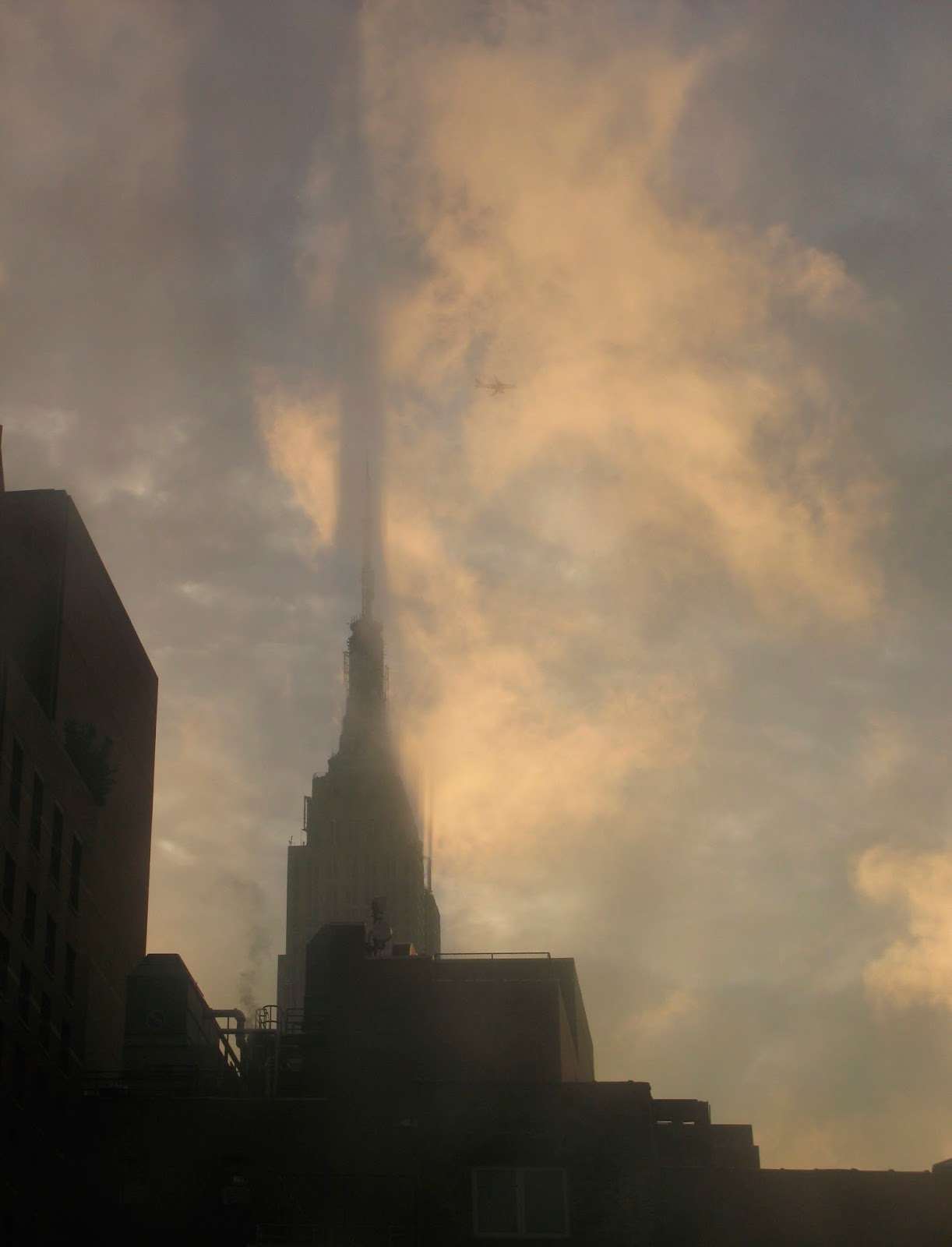 The Electro-Magnetic Shadows, created by the mulitiple Antennas on the Empire State Building, projecting upward through the low level clouds, as the Thunderstorm System moves through.